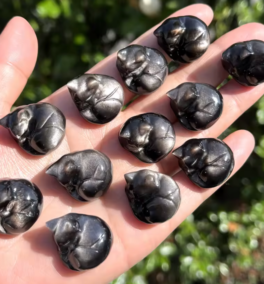 Peaceful and protective, these Silver Sheen Obsidian Sleepy Cats shimmer with a natural silvery glow that catches the light like moonlight on water. Each smooth figurine is carved from genuine silver sheen obsidian, a stone known for its grounding and shielding energy. Perfect for fall and Halloween merchandising, crystal collectors, or cat-lover gift tables, they add a touch of quiet elegance and mystical charm to any display. Their soothing feline shape and subtle metallic flash make them an easy, year-round favorite for crystal shops, metaphysical boutiques, and gift stores.