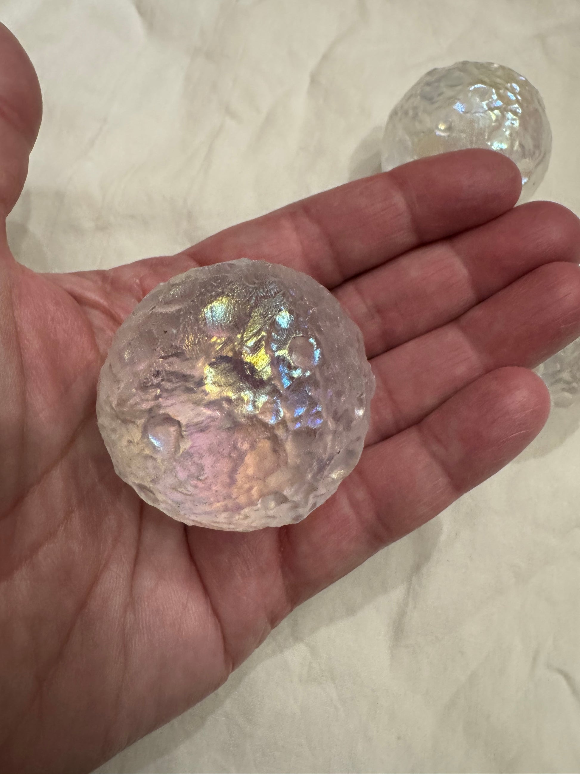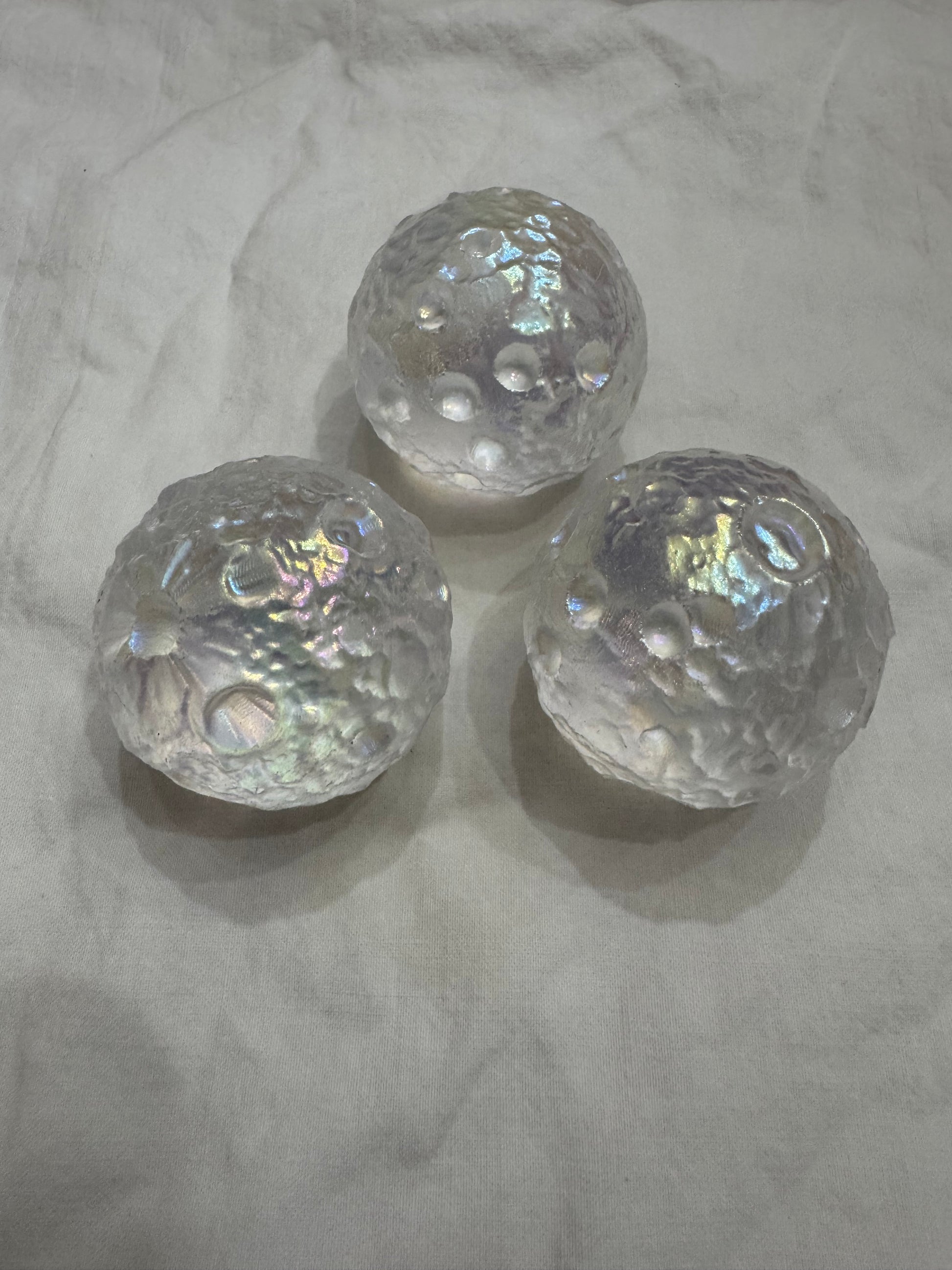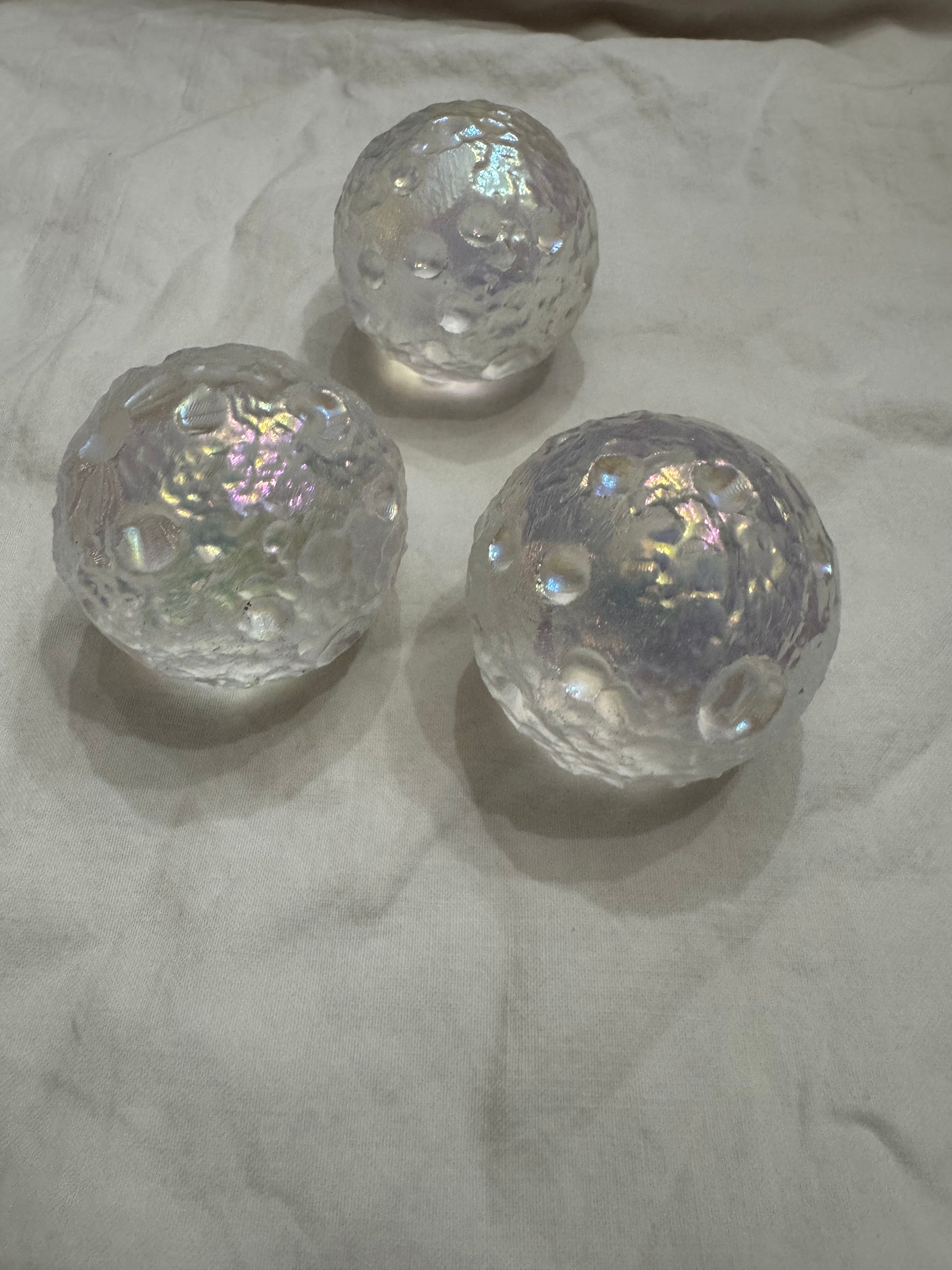 Get a little cosmic with our magical, multi-dimensional Angel Aura Quartz Moon Crater Spheres. Created to look just like the surface of the moon, this sphere is so captivating and enchanting with its shimmer. This unique sphere isn't just eye candy, it has significant symbology attached. The moon resonates strongly with feminine energy and is associated with cycles, seasons and the rhythm of time. Also amazing feature- It won't roll away from you as its unique textured surface keeps it grounded in place - no stands needed! Average size 1 3/4"
