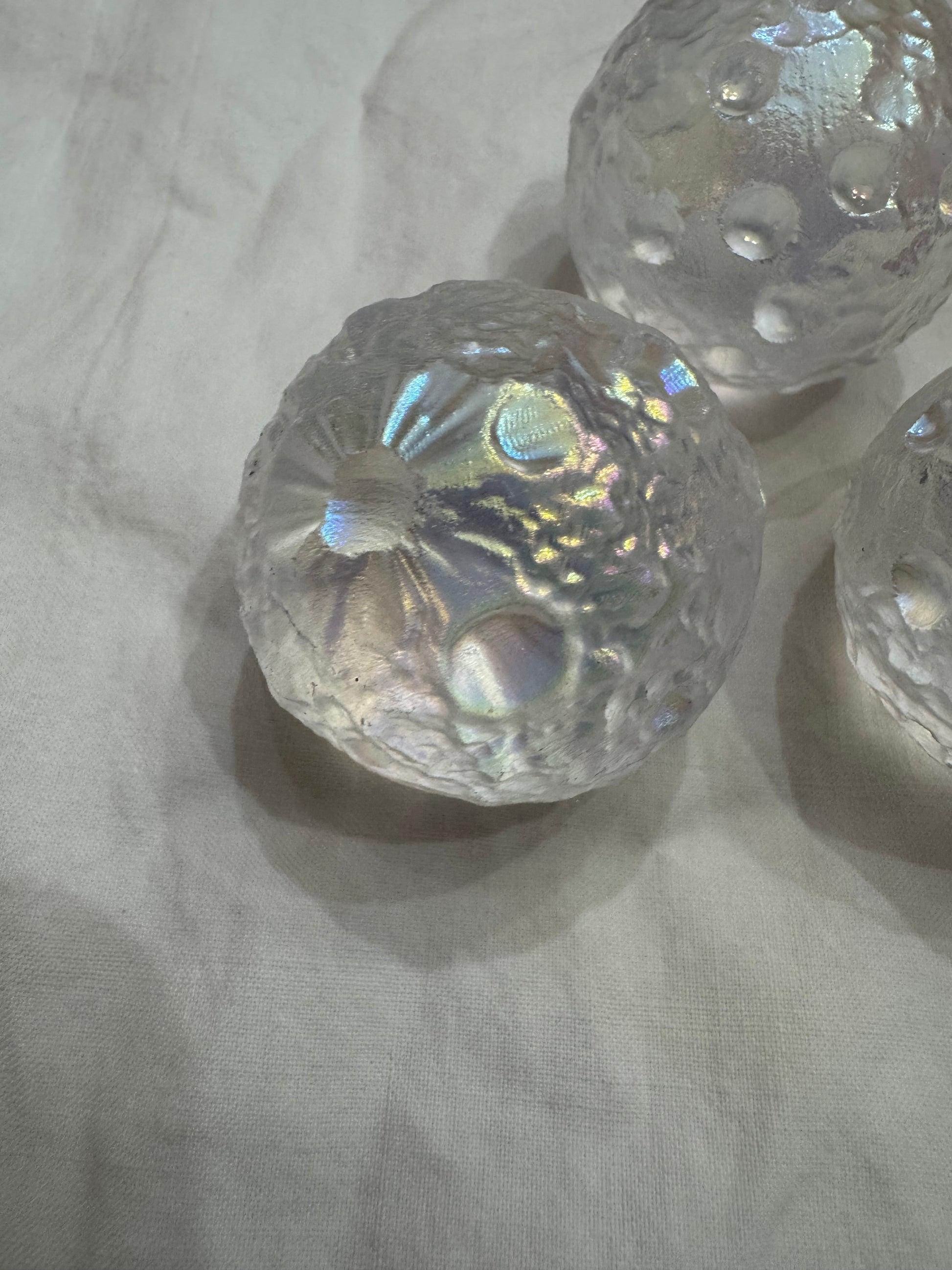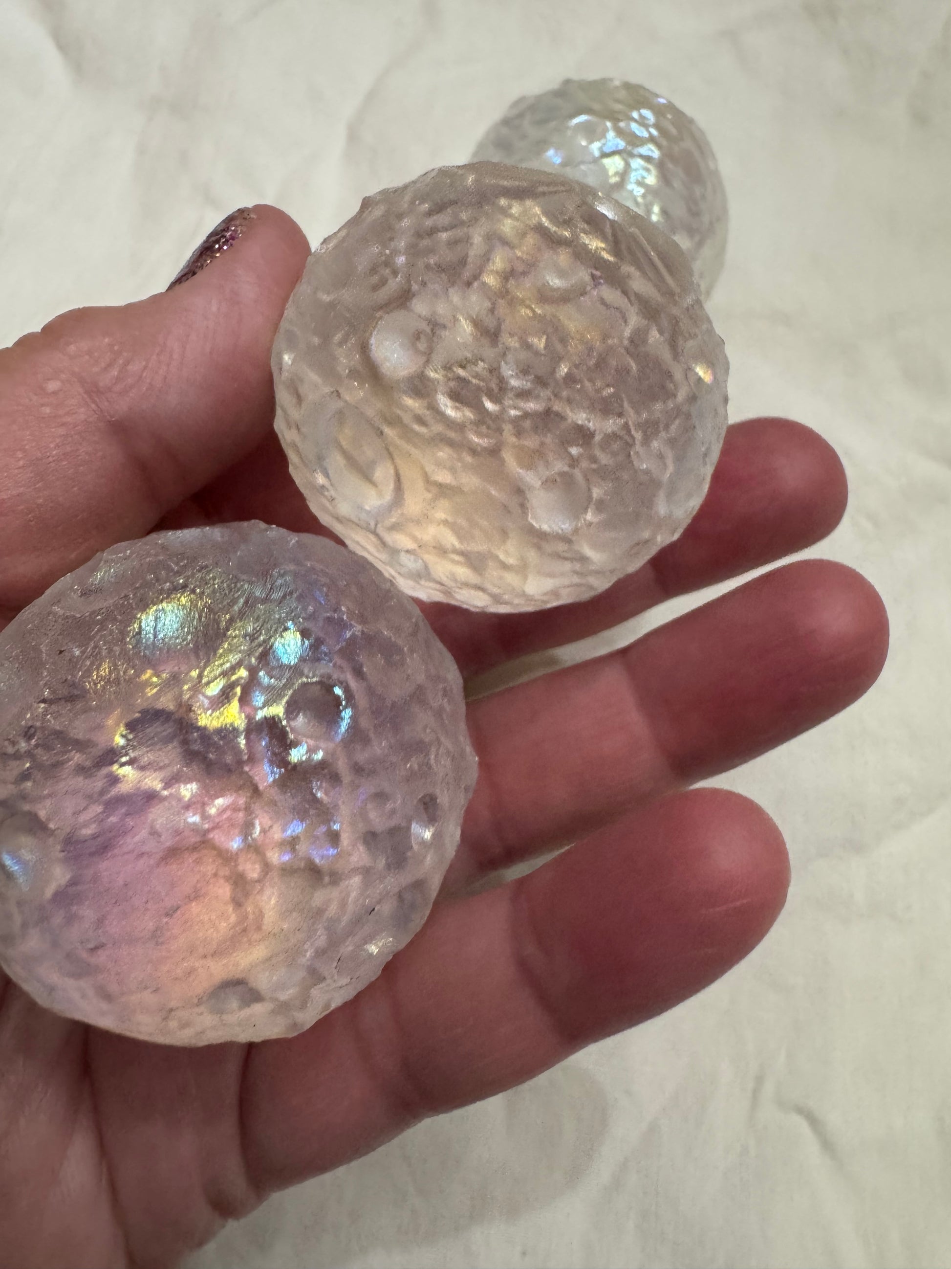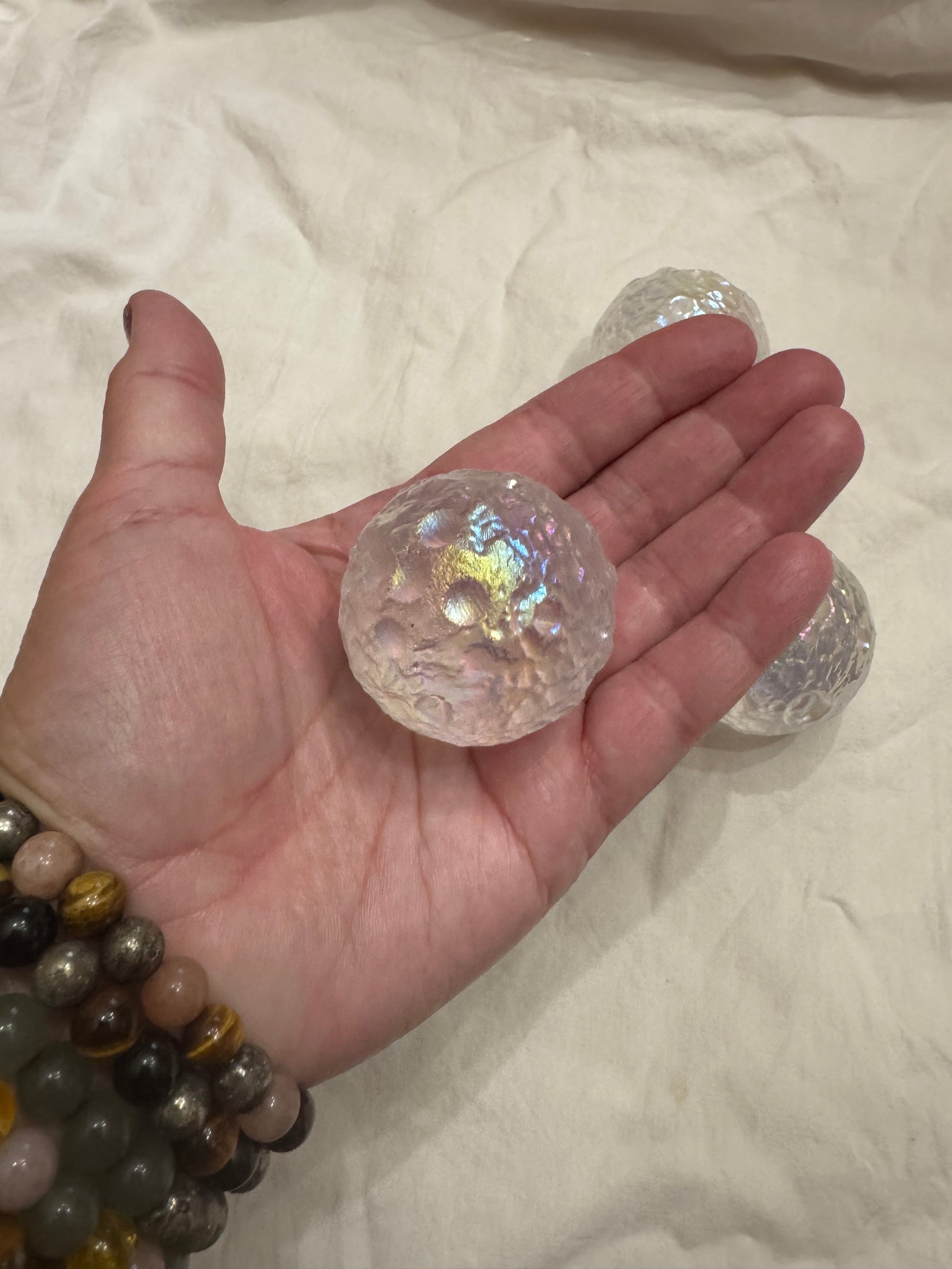 Get a little cosmic with our magical, multi-dimensional Angel Aura Quartz Moon Crater Spheres. Created to look just like the surface of the moon, this sphere is so captivating and enchanting with its shimmer. This unique sphere isn't just eye candy, it has significant symbology attached. The moon resonates strongly with feminine energy and is associated with cycles, seasons and the rhythm of time. Also amazing feature- It won't roll away from you as its unique textured surface keeps it grounded in place - no stands needed! Average size 1 3/4"