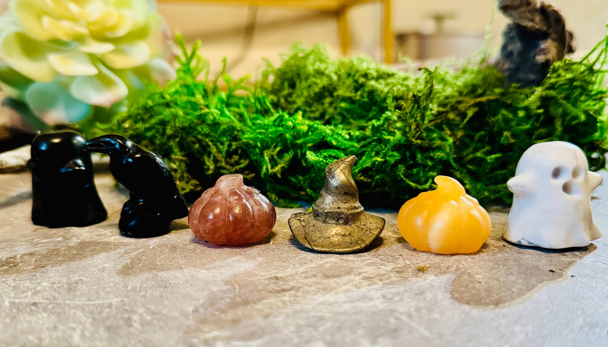 Perfect for Halloween and fall merchandising, these small sculptures are ideal for crystal bars, altar kits, and seasonal displays.