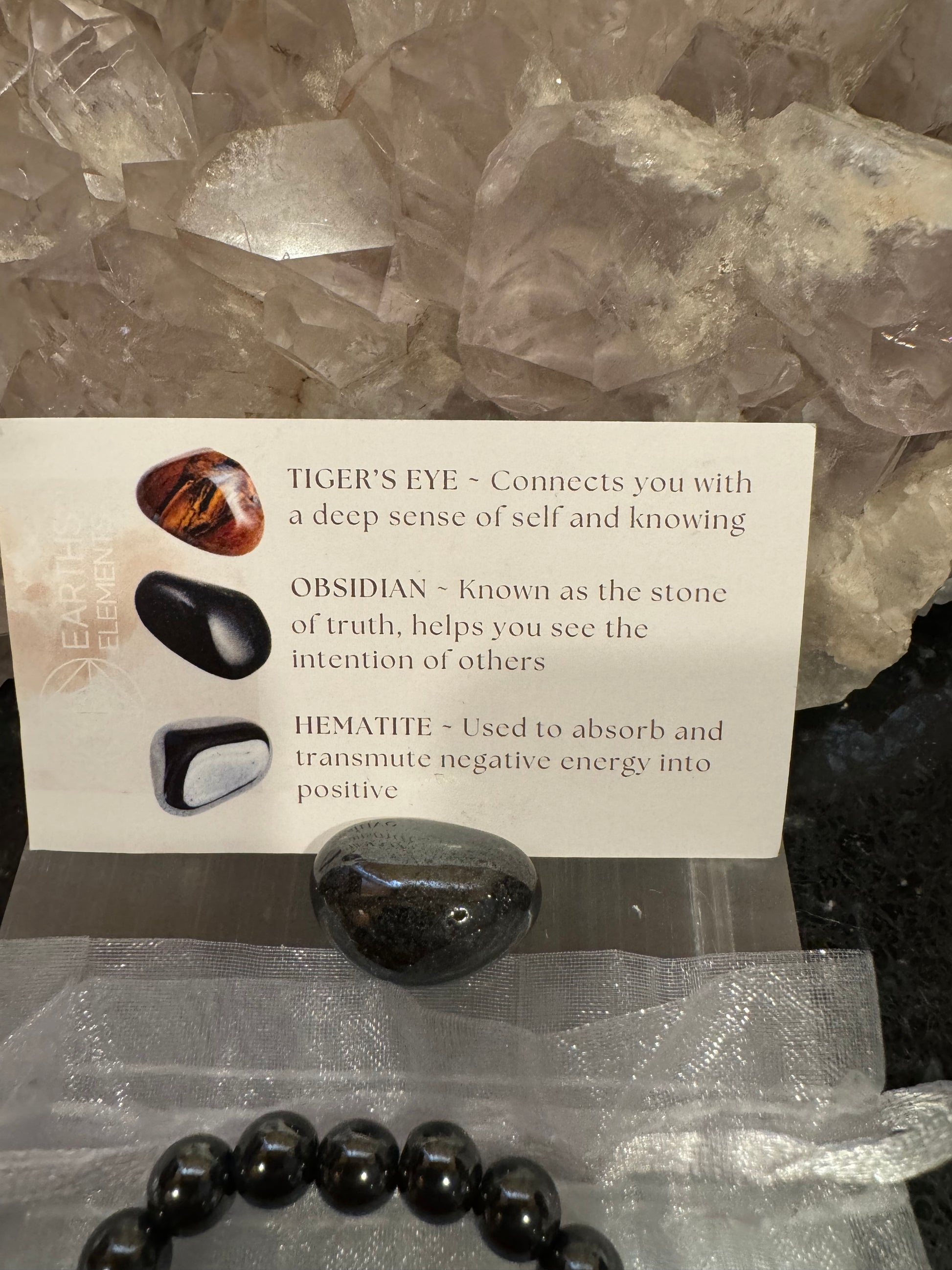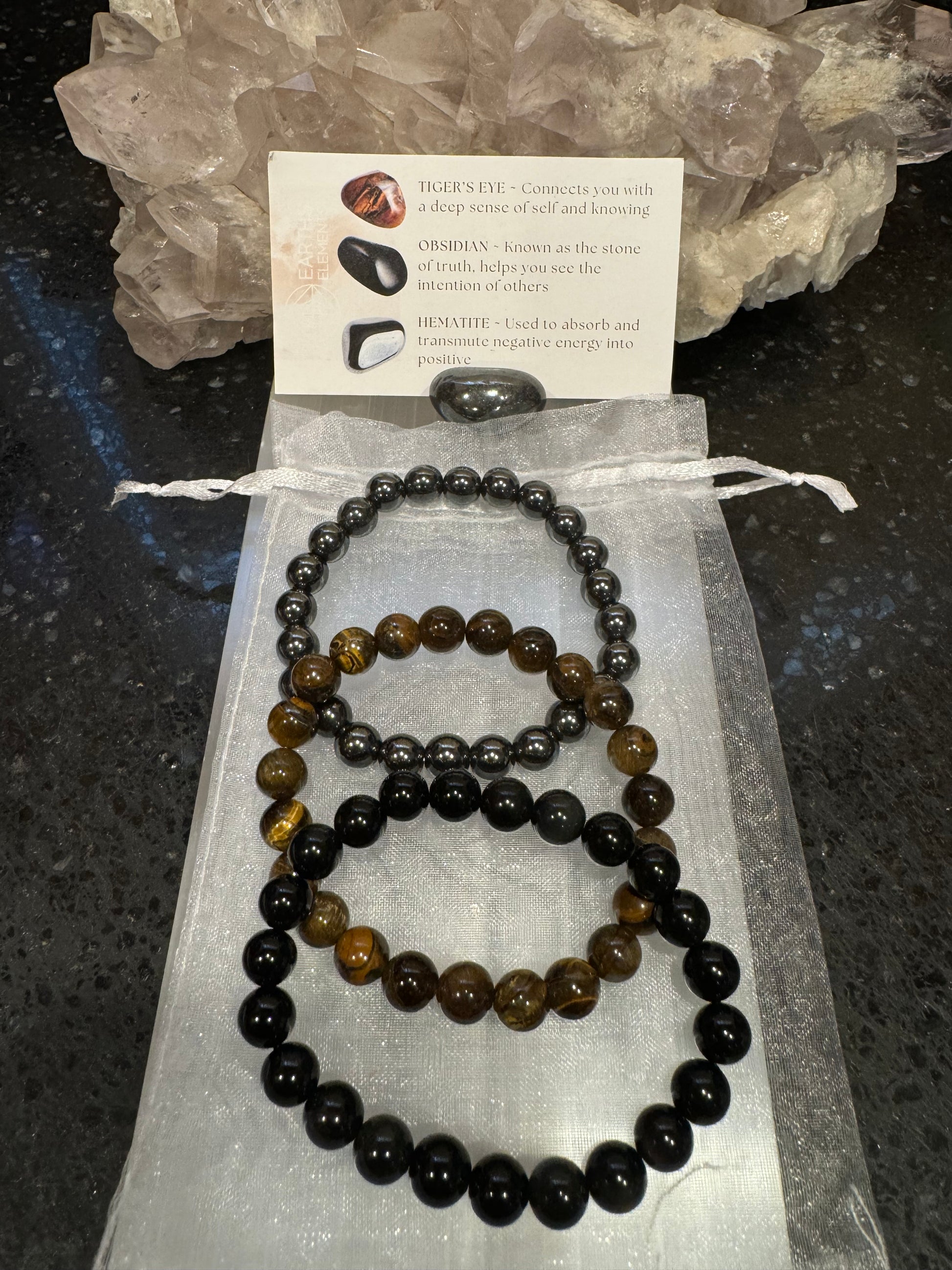 Intentions Bracelet Set - 8mm Protection Set comes in a transparent white organza bag which includes a Hematite tumble, a description card listing the crystal properties and one of each of the following 8mm bracelets: Hematite, Tiger's Eye & Black Obsidian